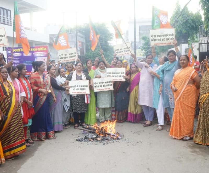 कांग्रेस जिलाध्यक्ष के आवास पर भाजपा महिला मोर्चा की 'हाय-हाय'...राहुल गांधी का पुतला फूंका