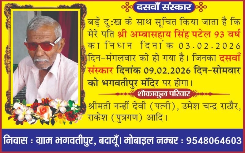 बदायूं। दैनिक जागरण के पत्रकार उमेश राठौर के पिता अंबासहाय का निधन हो गया। उनका दसवां संस्कार नौ फरवरी को भगवतीपुर स्थित मंदिर पर होगा।