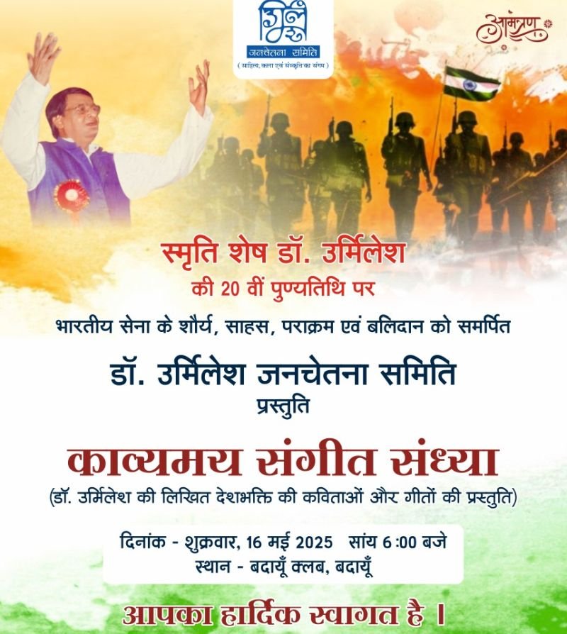 बदायूं। डॉ. उर्मिलेश जनचेतना समिति द्वारा शुक्रवार 16 मई को शाम छह बजे बदायूं क्लब बदायूं में काव्यमय संगीत संध्या का आयोजन किया जाएगा।