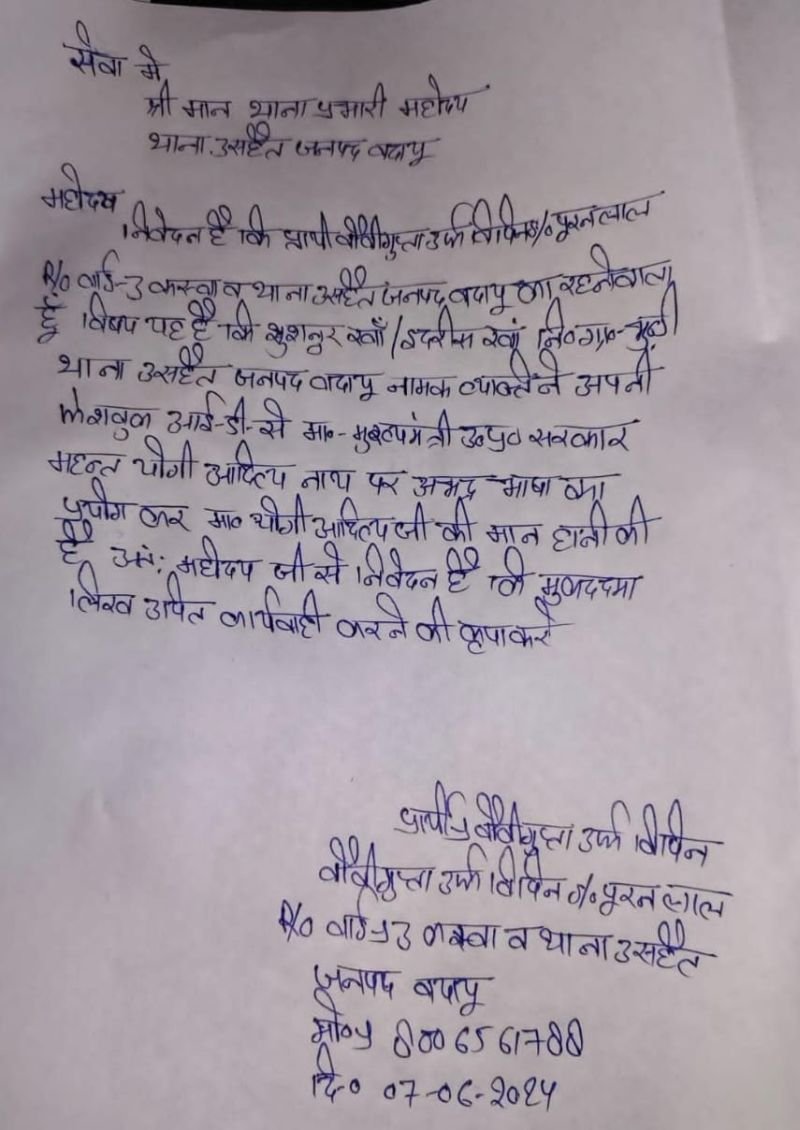 मुख्यमंत्री पर डाली गई टिप्पणी पर सोशल मीडिया अकाउंट खुशनूर खान के नाम से बता रहा है। इस संबंध में विश्व हिन्दू महासंघ गौरक्षा प्रकोष्ठ के जिला संगठन मंत्री बॉबी गुप्ता उर्फ़ विपिन ने उसहैत थाने में एक शिकायती पत्र दिया है।