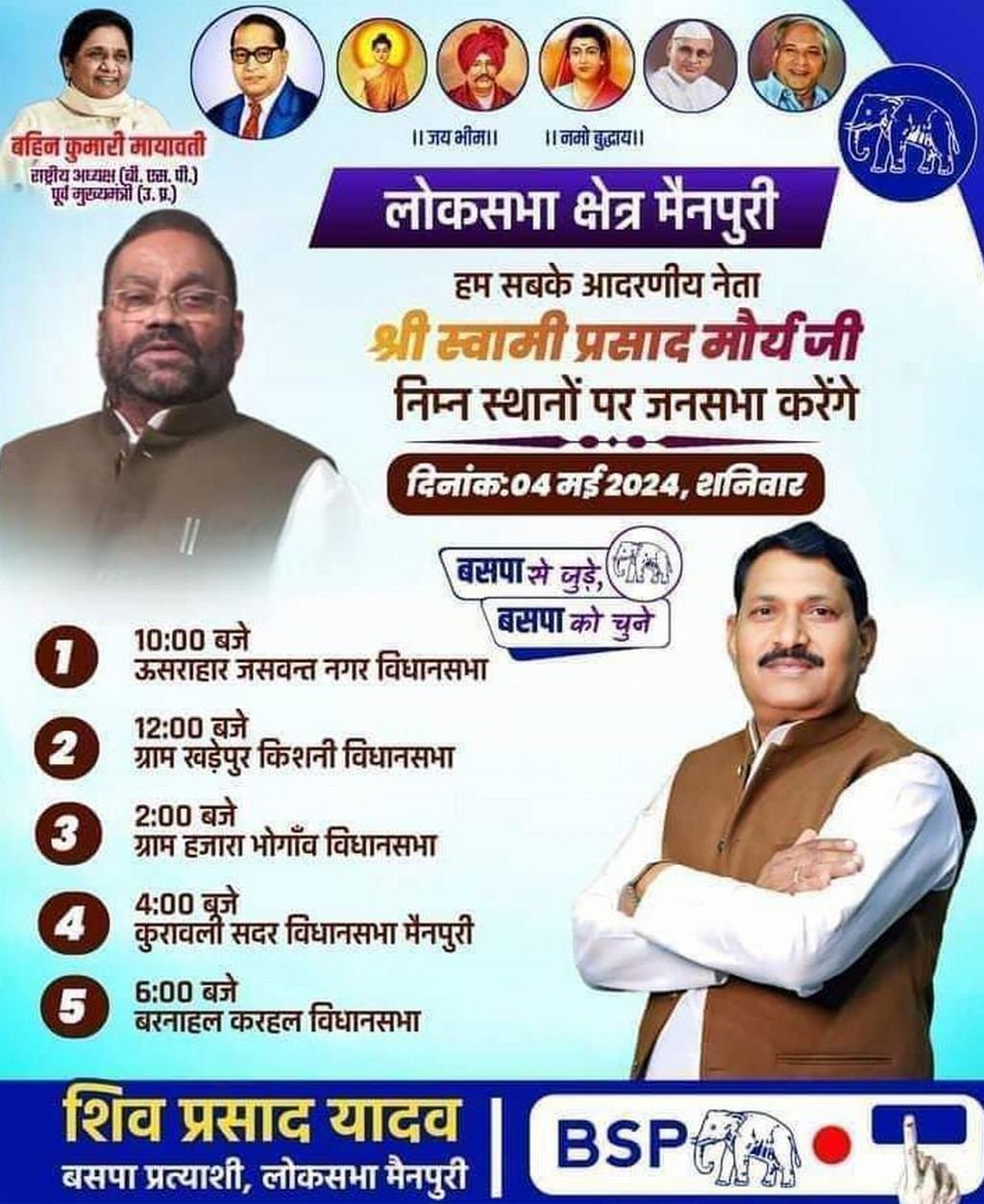 बदायूं। सपा से अलग होने तथा खुद की राष्ट्रीय शोषित समाज पार्टी बनाने वाले स्वामी प्रसाद मौर्य आने वाले दिनों में हाथी पर सवार होने को तैयार हैं। चर्चा है कि कुछ ही दिनों में वह बसपा में शामिल होकर चुनाव लड़ने का ऐलान भी कर सकते हैं। इधर सांसद संघमित्रा मौर्य जहां मैनपुरी में भाजपा प्रत्याशी का प्रचार कर रहीं हैं तो पिता स्वामी प्रसाद मैनपुरी से बसपा प्रत्याशी शिव प्रसाद यादव का चुनाव प्रचार करने में लगे हैं। बीती चार मई को उन्होंने बसपा प्रत्याशी के पक्ष में चुनावी जनसभा भी की। (नीचे और पढ़ें) -