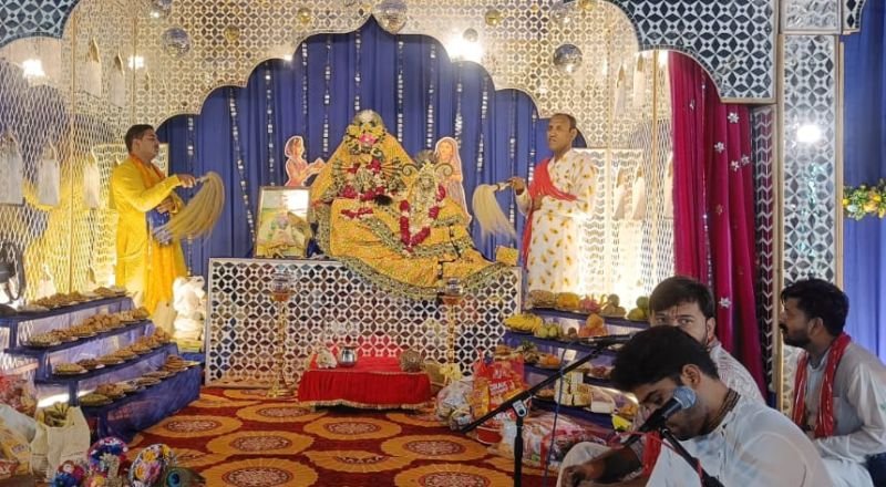 कृष्ण गोपाल ने किया। सरस्वती का पूजन रामकिशन दास ने किया। भजनों की पावन फुहार का आरम्भ मंडल के अध्यक्ष सूर्य प्रकाश के ‘बसा लो मुझे बरसाना‘ भजन से हुआ। रजत ने जब ‘छोटी सी किशोरी मेरे अंगना में डोले रे‘ भजन प्रस्तुत किया तो रसिक जनों के आखों के सामने किशोरी जी के बचपन का परिदृश्य जीवंत हो उठा। शिवम ने ‘नाम मेरी राधा रानी का जिस जिस ने गाया है‘ भजन गाकर समां बांध दिया। राधा माधव मंडल, पीलीभीत के दीपू अग्रवाल, नीरज अग्रवाल, अर्पित शुक्ला ने जैसे ही ब्रजभाव भजन नौका की पतवार थामीं, तो रसिकजनों ने श्रीराधा रसिक बिहारी के प्रेम में गोता लगाना आरम्भ कर दिया। श्याम संकीर्तन मंडल बिसौली के मनोज यादव ने अपने भजनों से रसिक जनों के मध्य बृजयात्रा का माहौल बना दिया। पठानकोट से पधारे अतुल कृष्ण शास्त्री मंच पर आये तो भक्तजनों ने