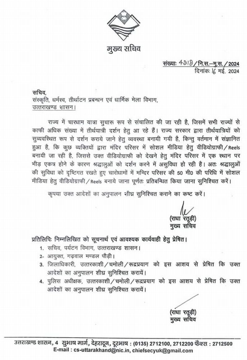 अब उत्तराखंड सरकार ने चारों धाम के मंदिरों के 50 मीटर के दायरे में रील्स या वीडियो बनाने पर रोक लगा दी है। उत्तराखंड राज्य के मुख्य सचिव राधा रतूड़ी ने आदेश जारी किया है कि केदारनाथ, गंगोत्री, यमुनोत्री और बदरीनाथ मंदिर परिसर के 50 मीटर के दायरे में रील बनाने और वीडियोग्राफी पर पाबंदी रहेगी। ऐसे में यदि यहां रील बनाई तो कार्रवाई की जद में भी आ सकते हैं।