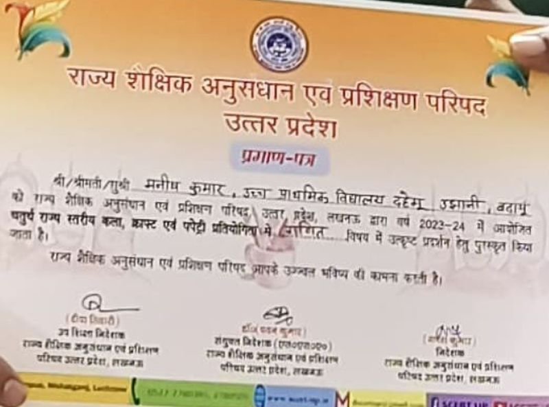 राज्य शैक्षिक अनुसंधान एवं प्रशिक्षण परिषद लखनऊ द्वारा शिक्षक मनीष का प्रमाण पत्र जिला शिक्षा एवं प्रशिक्षण संस्थान बदायूं को भेजा गया। इस अवसर पर