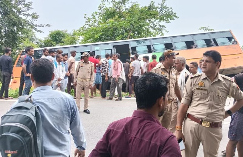 बस चालक ने टक्कर से बचने की कोशिश की, मगर संतुलन बिगड़ते ही बस लगभग 50 डिग्री झुककर सड़क किनारे खंती में जा घुसी।