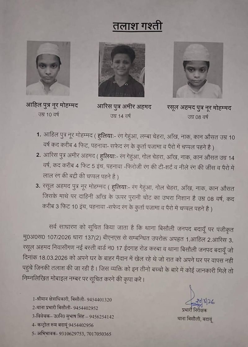 बदायूं। बिसौली के वार्ड संख्या 17 ईदगाह रोड के रहने वाले तीन बच्चे विगत 18 मार्च को घर के बाहर खेल रहे थे। इसके बाद वह लापता हो गए। पांच दिन गुजर जाने के बाद भी उनका कोई पता नहीं चला है। उनके परिवार वालों ने उनकी गुमशुदगी दर्ज कराई है। पुलिस ने भी बच्चों के फोटो के साथ पोस्टर चस्पा किए हैं।
