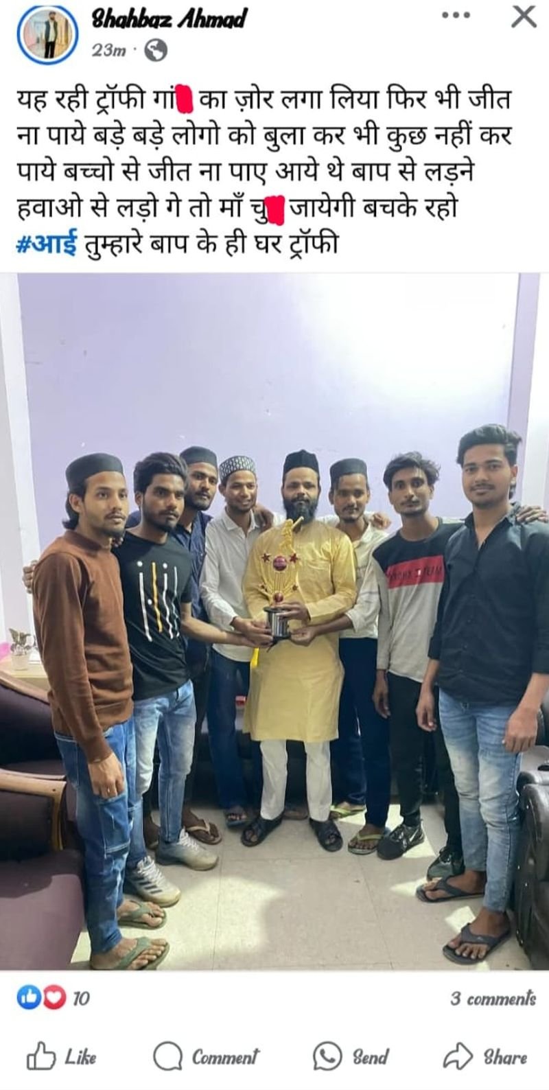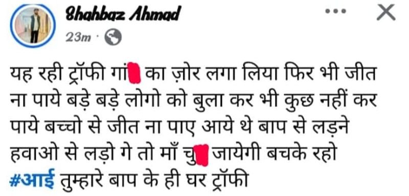 बदायूं। क्रिकेट टूर्नामेंट से बाहर हुई टीम के समर्थकों ने फेसबुक पर अभद्र पोस्ट कर दी, जिसकी शिकायत पुलिस से की गई है।